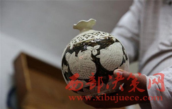 2016年9月23日,陜西榆林,“這件是遼代的石榴樽,你看上面的鴛鴦多漂亮。”劉福學(xué)打開(kāi)他的木箱,向來(lái)客展示他的藏品。