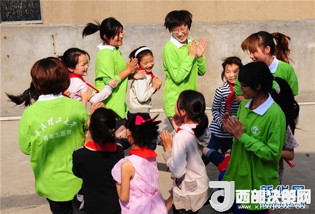 2011年4月28日,武漢理工大學(xué)研二學(xué)生郎坤和農(nóng)民工子弟學(xué)校武漢凌智小學(xué)的孩子們一起在屋頂平臺上做游戲。新華社記者 程敏 攝