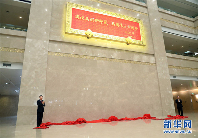 在贈(zèng)送紀(jì)念品儀式上,汪洋和寧夏回族自治區(qū)黨委書(shū)記、人大常委會(huì)主任石泰峰,一同為習(xí)近平總書(shū)記題詞賀匾揭幕。