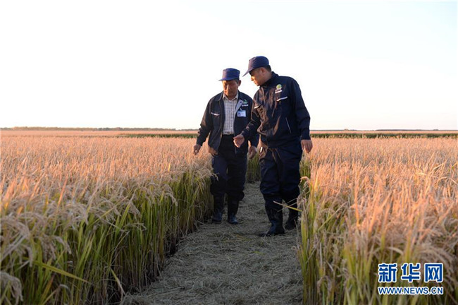 黑龍江建三江七星農(nóng)場職工秦泗利(左)和工友在查看今年水稻的長勢(9月26日攝)。 新華社記者王凱攝