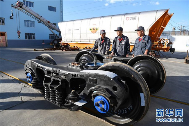 中車齊車集團有限公司教授級高工李向偉(中)介紹企業(yè)生產(chǎn)的重載技術領先的中交叉轉向架(9月26日攝)。 新華社記者王建威攝