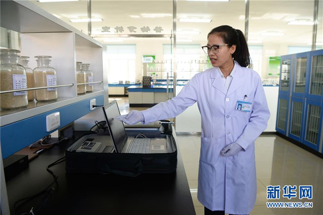 黑龍江北大荒建三江國家農(nóng)業(yè)科技園區(qū)工作人員裴鑫宇在做谷物品質(zhì)檢測(9月27日攝)。新華社記者王凱攝