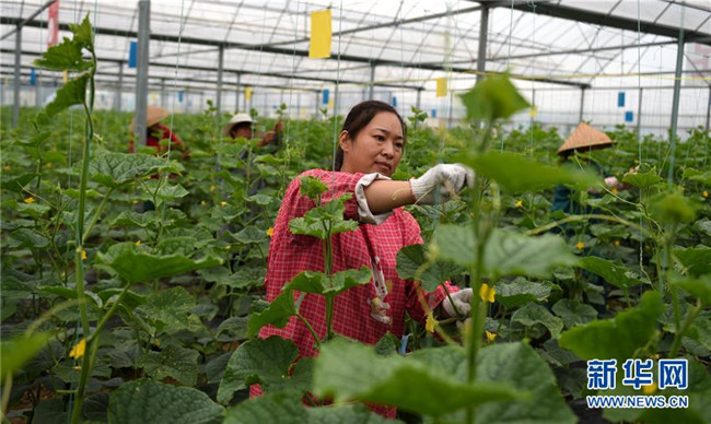 在河南新蔡縣磚店鎮(zhèn),一位村民在產(chǎn)業(yè)扶貧基地黃瓜溫棚里勞動(9月10日攝)。新華社發(fā)(宋超喜攝)
