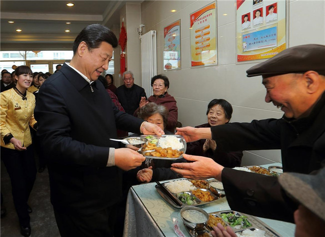 2013年2月4日,習(xí)近平來到蘭州一家“虛擬養(yǎng)老院”的養(yǎng)老餐廳,了解有關(guān)情況,還端起一個盛滿飯菜的餐盤,走到72歲的老人楊林太面前,輕輕送上,請他用餐。