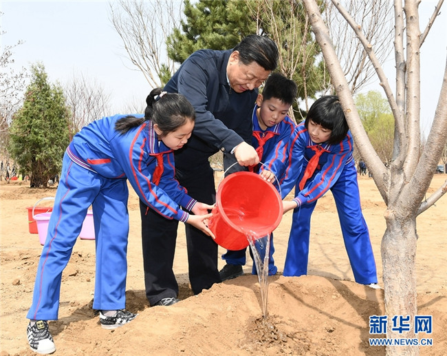 4月8日,黨和國家領(lǐng)導(dǎo)人習(xí)近平、栗戰(zhàn)書、汪洋、王滬寧、趙樂際、韓正、王岐山等來到北京市通州區(qū)永順鎮(zhèn)參加首都義務(wù)植樹活動。這是習(xí)近平同少先隊(duì)員一起給剛栽下的樹苗澆水。 新華社記者 謝環(huán)馳 攝