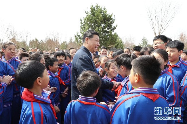 4月8日,黨和國家領(lǐng)導(dǎo)人習(xí)近平、栗戰(zhàn)書、汪洋、王滬寧、趙樂際、韓正、王岐山等來到北京市通州區(qū)永順鎮(zhèn)參加首都義務(wù)植樹活動。這是習(xí)近平同少先隊(duì)員在一起。 新華社記者 鞠鵬 攝