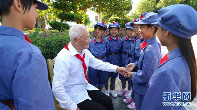 抗戰(zhàn)老兵萬(wàn)更志(左二)給江西省于都縣長(zhǎng)征源小學(xué)的學(xué)生講述紅色故事(2018年9月29日攝)。新華社記者 胡晨歡 攝