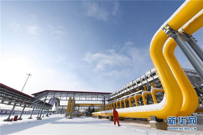 在中俄東線天然氣管道北段黑河首站場(chǎng)區(qū),工作人員從管線旁經(jīng)過(2019年11月19日攝)。 新華社記者 王建威 攝