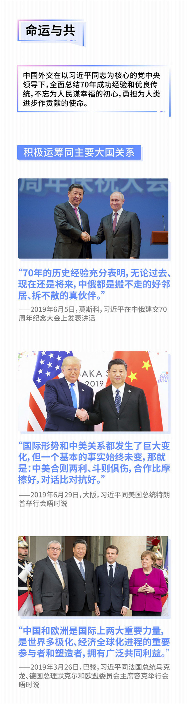 發(fā)展道路上的真誠(chéng)伙伴、國(guó)際事務(wù)中的“天然同盟軍”,過去一年,中國(guó)同發(fā)展中國(guó)家團(tuán)結(jié)合作的大文章更加充實(shí)豐富。習(xí)近平主席在二十國(guó)集團(tuán)領(lǐng)導(dǎo)人大阪峰會(huì)期間主持中非領(lǐng)導(dǎo)人會(huì)晤,上任后第五次踏上拉美土地,向中非合作論壇北京峰會(huì)成果落實(shí)協(xié)調(diào)人會(huì)議、第四屆中國(guó)—阿拉伯國(guó)家博覽會(huì)親致賀信……在元首外交引領(lǐng)推動(dòng)下,中非、中拉、中阿合作之路更加寬闊。
