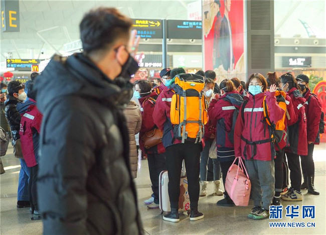 1月26日,陜西省援助湖北應(yīng)對(duì)新型冠狀病毒感染的肺炎疫情醫(yī)療隊(duì)隊(duì)員從西安出發(fā)。新華社記者 李一博 攝