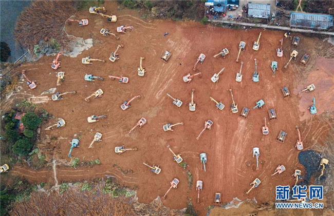 1月26日,在武漢雷神山醫(yī)院建設(shè)工地,大型機(jī)械加緊施工(無人機(jī)照片)。新華社記者 肖藝九 攝