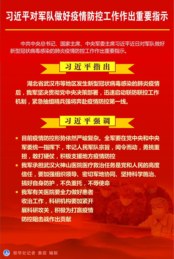 中共中央總書記、國家主席、中央軍委主席習(xí)近平近日對(duì)軍隊(duì)做好新型冠狀病毒感染的肺炎疫情防控工作作出重要指示。