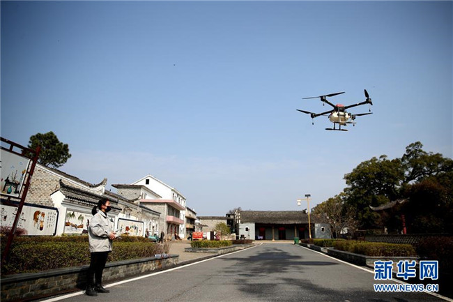 在江西省吉安市峽江縣馬埠鎮(zhèn)上蓋村,農機合作社飛手操作無人機進行消殺作業(yè)(2月1日攝)。 新華社發(fā)(陳福平 攝)