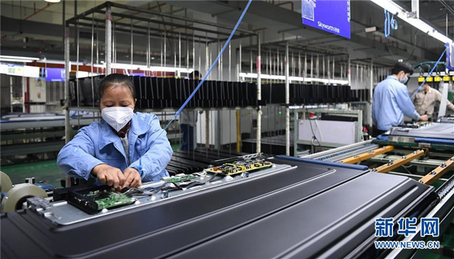 在位于廣州開發(fā)區(qū)的廣州創(chuàng)維平面顯示科技有限公司生產(chǎn)車間內(nèi),工人們?cè)诹魉€上作業(yè)(2月10日攝)。新華社記者 鄧華 攝