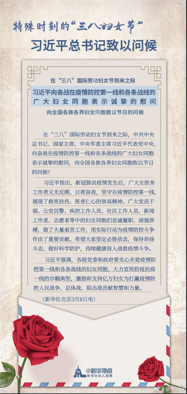 習(xí)近平向奮戰(zhàn)在疫情防控第一線和各條戰(zhàn)線的廣大婦女同胞表示誠摯的慰問