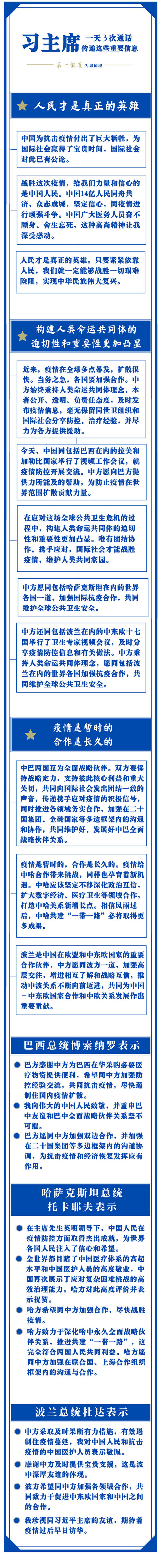 頻密互動,高效溝通。習(xí)主席通話內(nèi)容信息量很大:介紹中國抗疫努力,深化國際抗疫合作,推動雙邊關(guān)系發(fā)展……其中,“合作”與“人類命運(yùn)共同體”是習(xí)主席反復(fù)提到的關(guān)鍵詞。