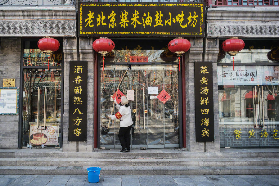 在北京前門大街,清潔工人打掃店鋪的門窗。(新華社記者彭子洋 攝)