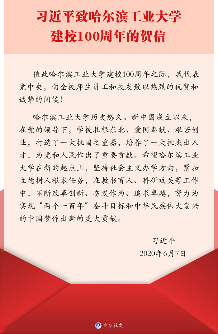 中共中央總書記、國家主席、中央軍委主席習近平7日致信祝賀哈爾濱工業(yè)大學建校100周年,向全校師生員工和校友致以熱烈的祝賀和誠摯的問候。