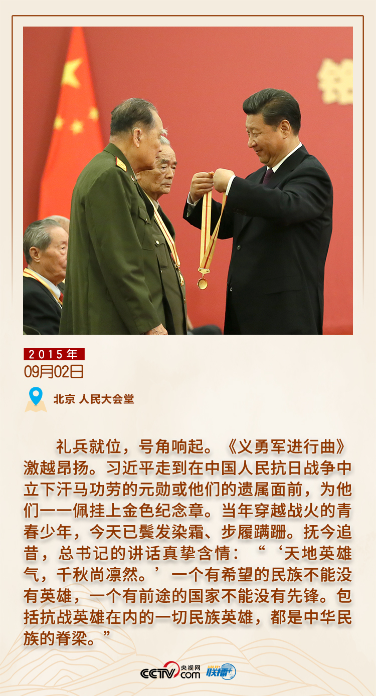 黨的十八大以來,國家通過立法確定了中國人民抗日戰(zhàn)爭勝利紀念日、烈士紀念日、南京大屠殺死難者國家公祭日。天安門廣場、人民大會堂、烈士陵園、抗日戰(zhàn)爭紀念館……這些鐫刻歷史記憶的地方,處處留下了習近平總書記緬懷先烈、崇尚英雄的身影和足跡。