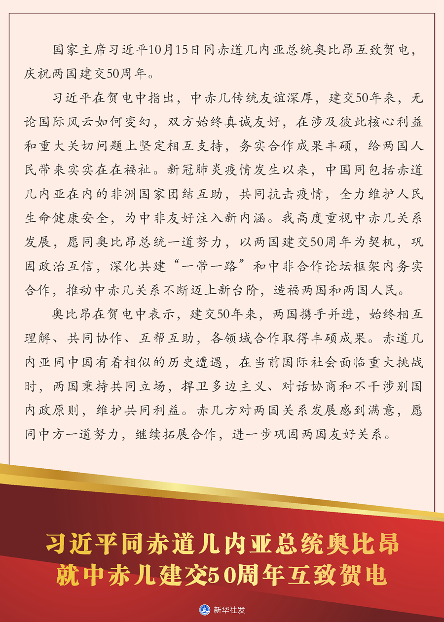 習(xí)近平在賀電中指出,中赤幾傳統(tǒng)友誼深厚,建交50年來,無論國際風(fēng)云如何變幻,雙方始終真誠友好,在涉及彼此核心利益和重大關(guān)切問題上堅(jiān)定相互支持,務(wù)實(shí)合作成果豐碩,給兩國人民帶來實(shí)實(shí)在在福祉。新冠肺炎疫情發(fā)生以來,中國同包括赤道幾內(nèi)亞在內(nèi)的非洲國家團(tuán)結(jié)互助,共同抗擊疫情,全力維護(hù)人民生命健康安全,為中非友好注入新內(nèi)涵。我高度重視中赤幾關(guān)系發(fā)展,愿同奧比昂總統(tǒng)一道努力,以兩國建交50周年為契機(jī),鞏固政治互信,深化共建“一帶一路”和中非合作論壇框架內(nèi)務(wù)實(shí)合作,推動中赤幾關(guān)系不斷邁上新臺階,造福兩國和兩國人民。