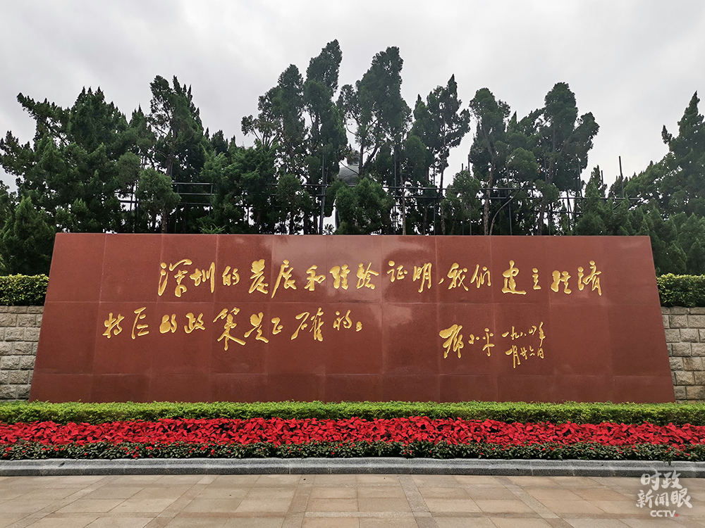 △鄧小平銅像北側(cè)是一塊長(zhǎng)達(dá)13米、高4.35米的花崗巖石墻,石墻北面鐫刻著鄧小平同志1984年視察深圳時(shí)的題詞:“深圳的發(fā)展和經(jīng)驗(yàn)證明,我們建立經(jīng)濟(jì)特區(qū)的政策是正確的。”(總臺(tái)央視記者王冰拍攝)