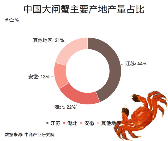 大閘蟹的十大產(chǎn)區(qū)中,江蘇占據(jù)半壁江山,固城湖、洪澤湖、太湖、高郵湖、陽澄湖產(chǎn)區(qū)都在江蘇,江蘇總產(chǎn)量約占全國的44%,市場(chǎng)最受歡迎的陽澄湖大閘蟹與洪澤湖大閘蟹都是產(chǎn)自江蘇。