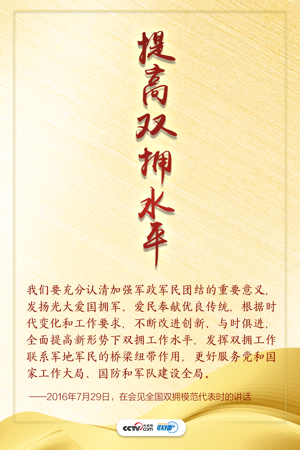 習近平總書記始終高度重視雙擁工作,多次在重要會議、國內(nèi)考察時親力親為指導(dǎo)推動。他強調(diào)擁軍優(yōu)屬、擁政愛民是我黨我軍特有的政治優(yōu)勢,堅如磐石的軍政軍民關(guān)系是我們戰(zhàn)勝一切艱難險阻、不斷從勝利走向勝利的重要法寶。