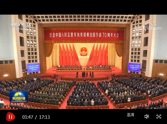 紀(jì)念中國(guó)人民志愿軍抗美援朝出國(guó)作戰(zhàn)70周年大會(huì)23日上午在北京人民大會(huì)堂隆重舉行。中共中央總書記、國(guó)家主席、中央軍委主席習(xí)近平在會(huì)上發(fā)表重要講話強(qiáng)調(diào),偉大的抗美援朝戰(zhàn)爭(zhēng),抵御了帝國(guó)主義侵略擴(kuò)張,捍衛(wèi)了新中國(guó)安全,保衛(wèi)了中國(guó)人民和平生活,穩(wěn)定了朝鮮半島局勢(shì),維護(hù)了亞洲和世界和平?;赝?0年前偉大的抗美援朝戰(zhàn)爭(zhēng),進(jìn)行具有許多新的歷史特點(diǎn)的偉大斗爭(zhēng),瞻望中華民族偉大復(fù)興的光明前景,我們無比堅(jiān)定、無比自信。我們要銘記抗美援朝戰(zhàn)爭(zhēng)的艱辛歷程和偉大勝利,弘揚(yáng)偉大抗美援朝精神,雄赳赳、氣昂昂,向著全面建設(shè)社會(huì)主義現(xiàn)代化國(guó)家新征程,向著實(shí)現(xiàn)中華民族偉大復(fù)興的中國(guó)夢(mèng)繼續(xù)奮勇前進(jìn)。