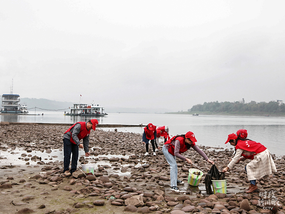△重慶永川區(qū)志愿者在長(zhǎng)江朱沱段撿拾垃圾。