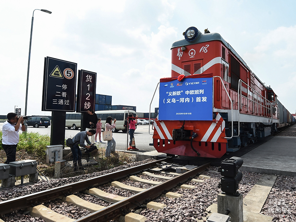 △今年10月10日,“義新歐”中歐班列(義烏—河內(nèi))從義烏西站首發(fā)啟程,最終將抵達(dá)越南河內(nèi)站。這是該班列首次開通面向東南亞國家和地區(qū)的南向通道。