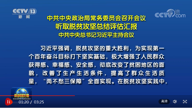 12月3日,中共中央政治局常務(wù)委員會(huì)召開會(huì)議,聽取脫貧攻堅(jiān)總結(jié)評(píng)估匯報(bào)。習(xí)近平總書記主持會(huì)議并發(fā)表重要講話。在講話中,總書記總結(jié)了黨的十八大以來脫貧攻堅(jiān)工作取得的成績,肯定了各級(jí)黨委和政府以及社會(huì)協(xié)同發(fā)力、合力攻堅(jiān)的卓越付出。央視網(wǎng)《聯(lián)播+》特梳理講話及會(huì)議要點(diǎn),以饗讀者。