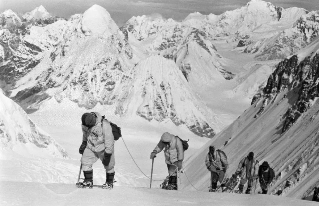 1960年5月,中國登山隊(duì)隊(duì)員在海拔7150米的冰雪坡上行進(jìn)。 新華社發(fā)