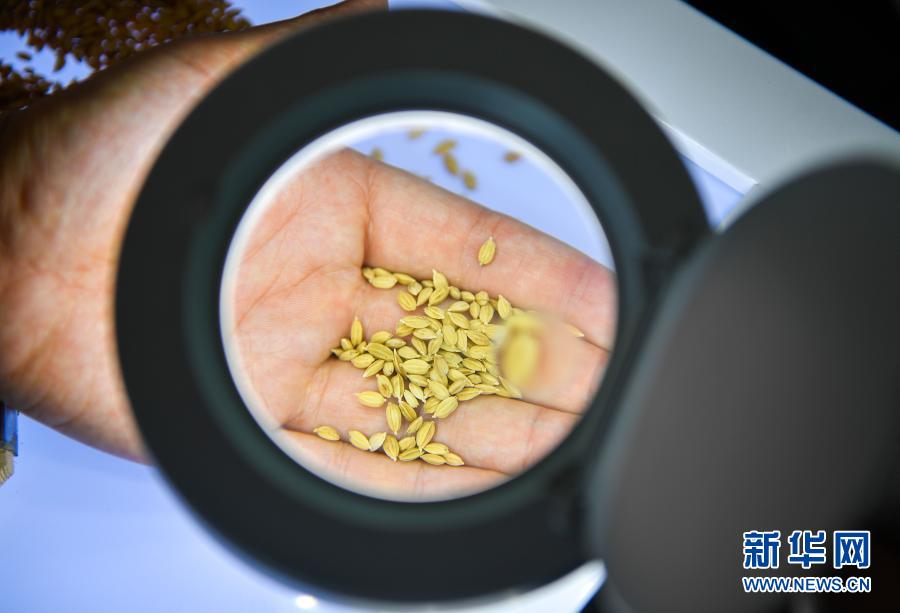 在吉林省吉林市永吉縣一拉溪鎮(zhèn)九月豐家庭農(nóng)場,工作人員在實(shí)驗(yàn)室中檢測一批試種水稻的稻谷外觀(8月12日攝)。新華社記者 許暢 攝