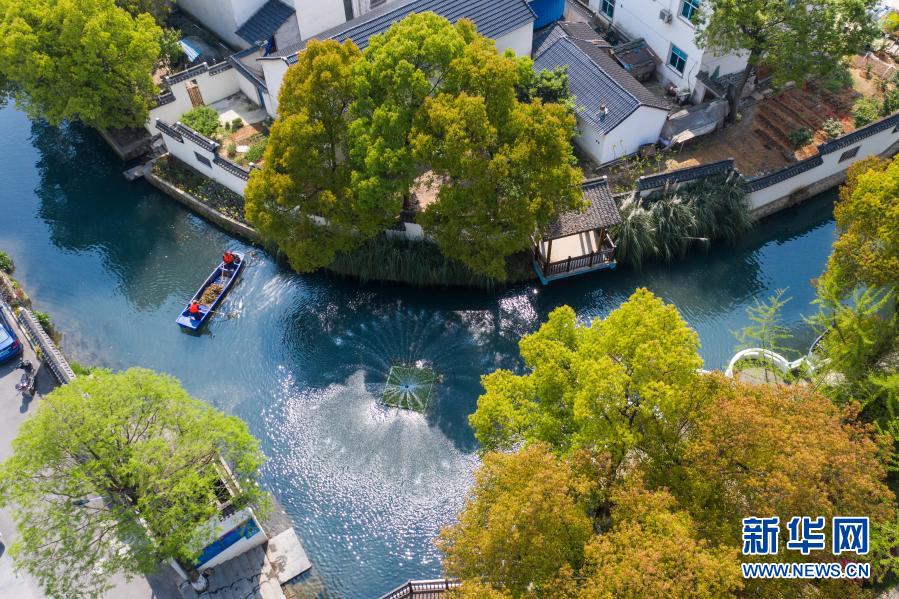 浙江省長興縣龍山街道渚山村,保潔人員進(jìn)行日常河道護(hù)理巡查(4月9日攝,無人機(jī)照片)。新華社記者 徐昱 攝