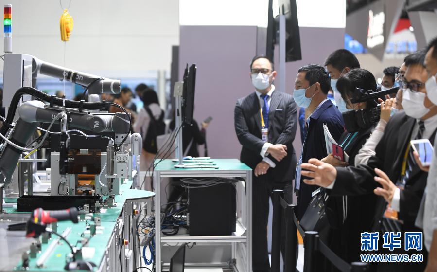 2020年11月6日,在進(jìn)博會(huì)技術(shù)裝備展區(qū),人們?cè)谖鏖T子展臺(tái)觀看人機(jī)協(xié)作的智能化單元生產(chǎn)線。新華社記者 李任滋 攝