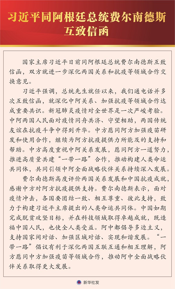 國家主席習(xí)近平日前同阿根廷總統(tǒng)費爾南德斯互致信函,雙方就進(jìn)一步深化兩國關(guān)系和抗疫等領(lǐng)域合作交換意見。