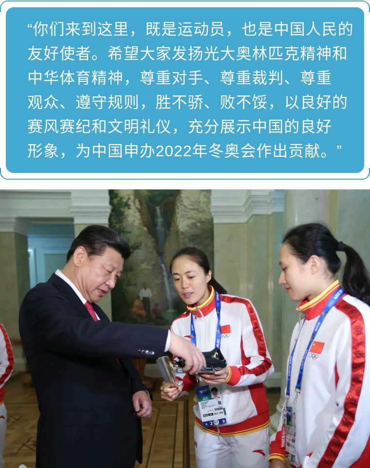 ↑2014年2月7日,中共中央總書記、國家主席、中央軍委主席習近平在俄羅斯索契親切看望參加第二十二屆冬季奧林匹克運動會的中國體育代表團。這是運動員向習近平介紹冰雪運動器材。新華社記者 蘭紅光 攝