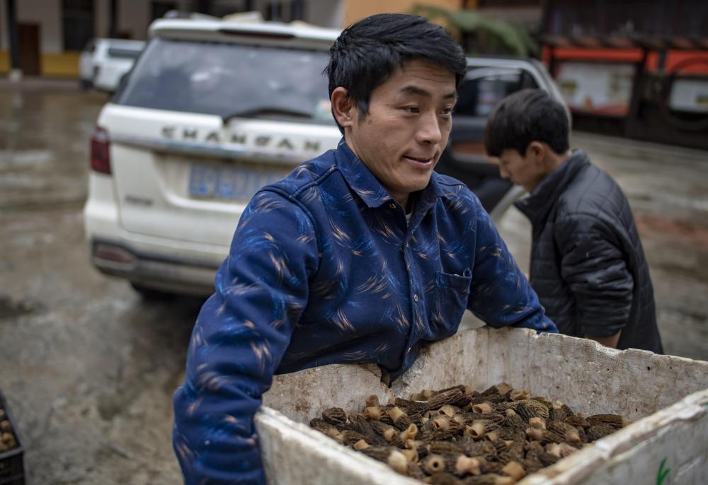 云南貢山縣獨(dú)龍江鄉(xiāng)龍?jiān)?ldquo;致富能手”和曉永在鄉(xiāng)里賣羊肚菌(2019年4月19日攝)。 新華社記者 江文耀 攝
