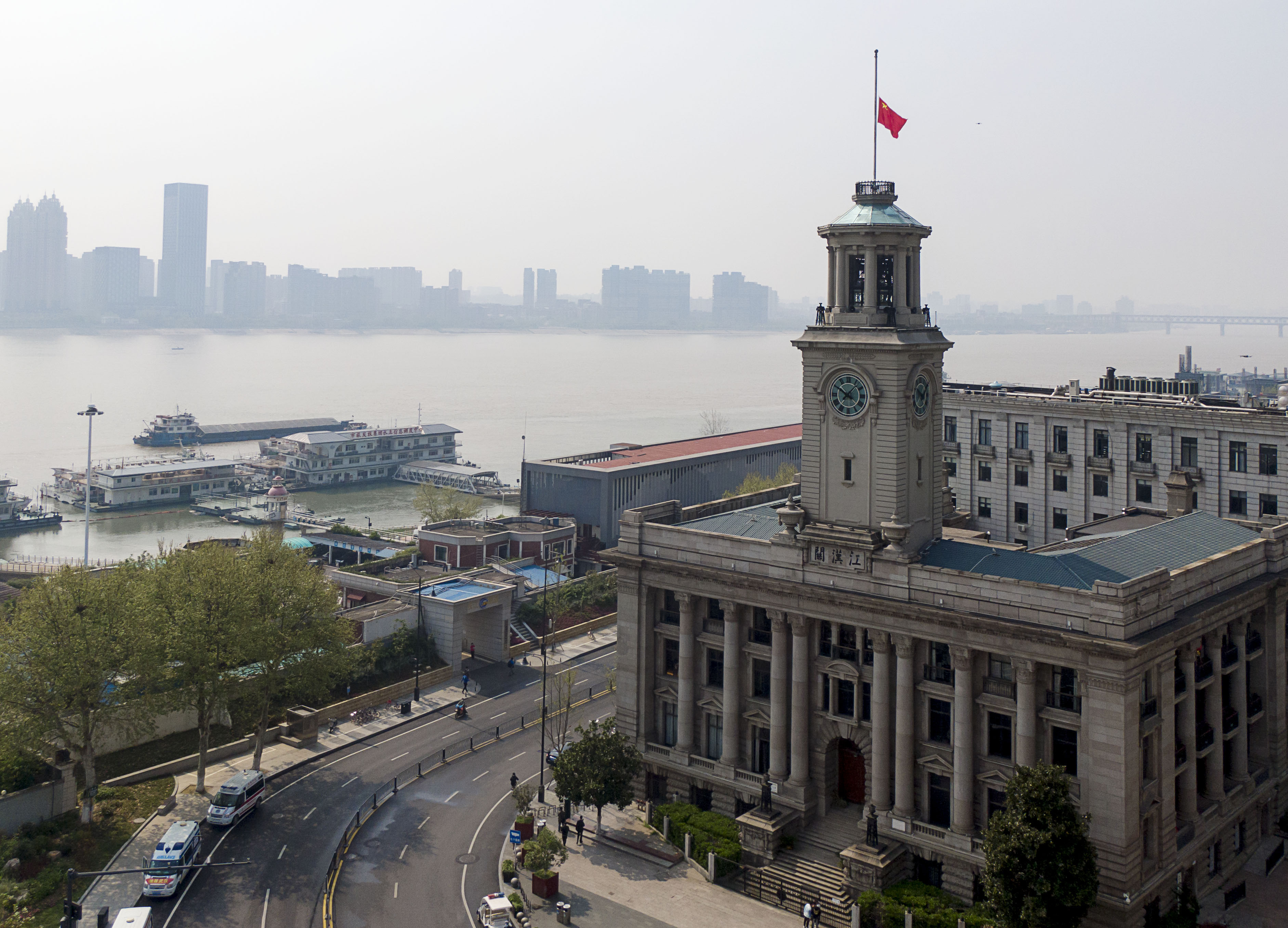 ↑2020年4月4日,武漢市舉行哀悼活動,表達對抗擊新冠肺炎疫情斗爭犧牲烈士和逝世同胞的深切哀悼。這是武漢江漢關大樓下半旗志哀。新華社記者 熊琦 攝