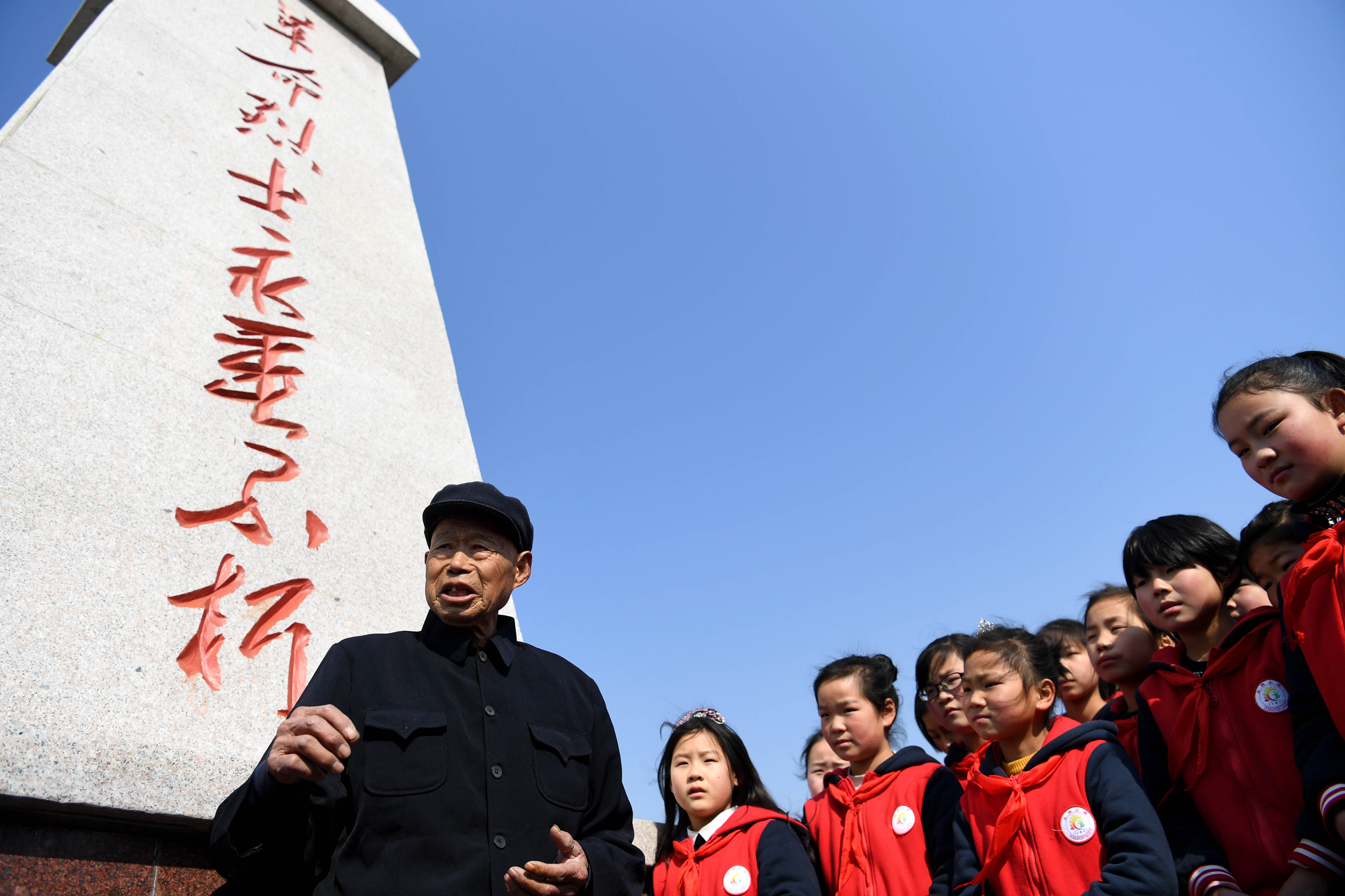 ↑今年89歲的胡兆倫是安徽省懷遠縣陳集鎮(zhèn)胡劉烈士陵園管理員,70多年如一日為英烈們守墓。這是他在烈士陵園為前來掃墓的小學生講解烈士的事跡(2019年3月14日攝)。新華社記者劉軍喜攝