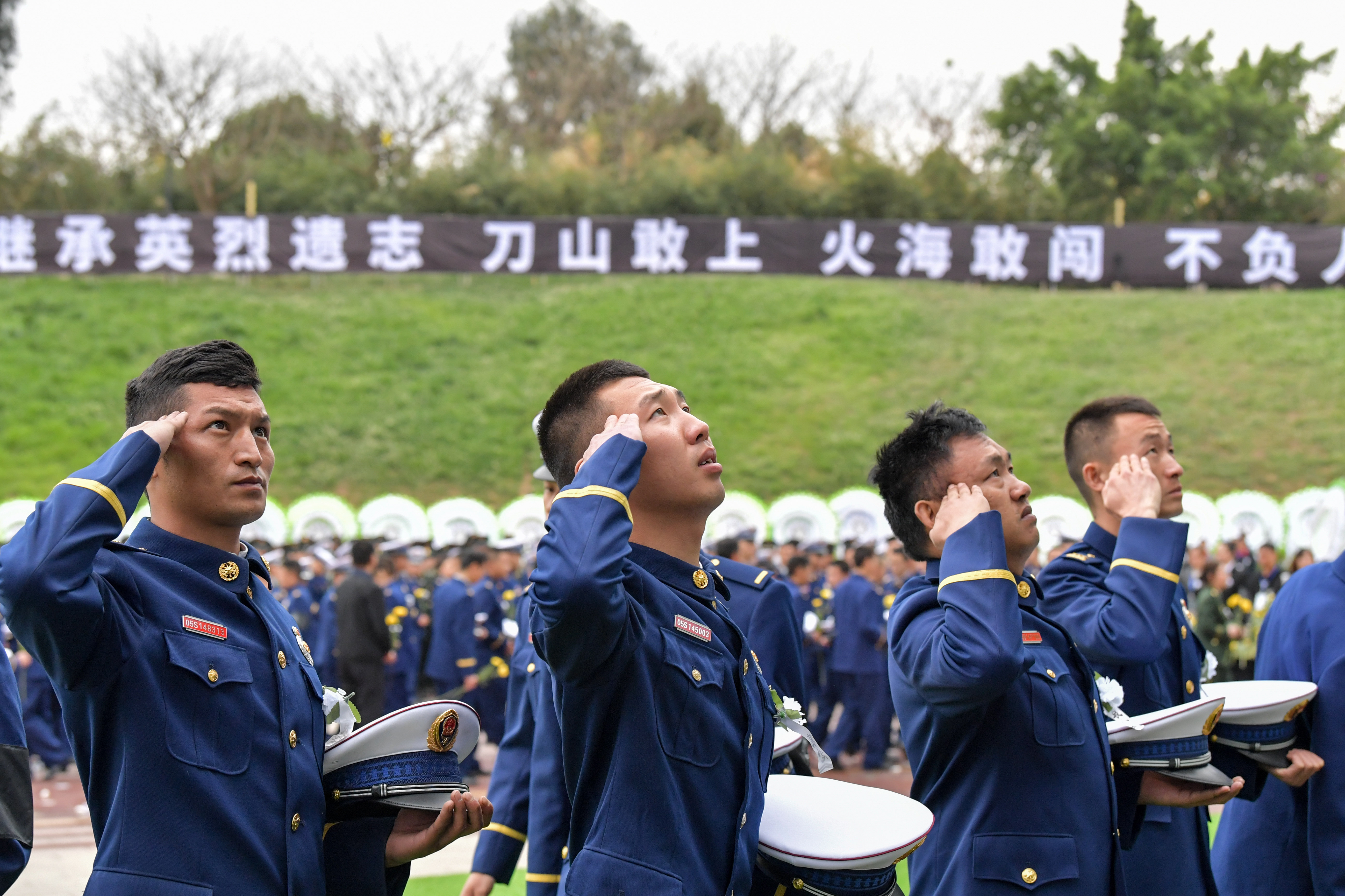 ↑2019年4月4日,參加四川木里森林火災撲救中英勇犧牲烈士悼念活動的森林消防官兵向犧牲的戰(zhàn)友敬禮。在這場火災中,共有27名森林消防隊員犧牲。新華社記者 張超群 攝