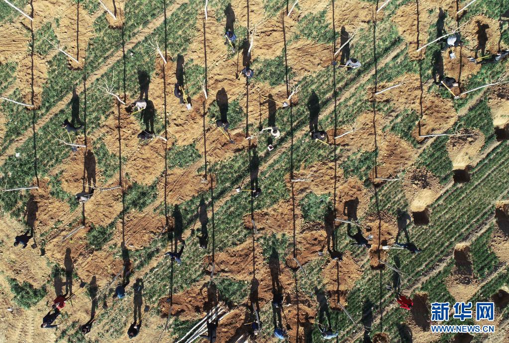 志愿者在河北省武安市伯延鎮(zhèn)伯延村植樹(2019年3月12日攝,無人機照片)。新華社記者 王曉 攝