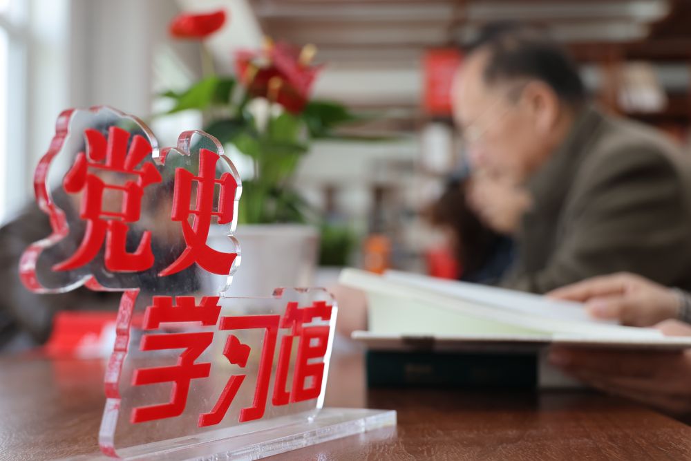 ↑2021年3月16日,人們在河北黃驊市驊中街道信譽樓社區(qū)黨史學(xué)習(xí)館學(xué)習(xí)黨史。