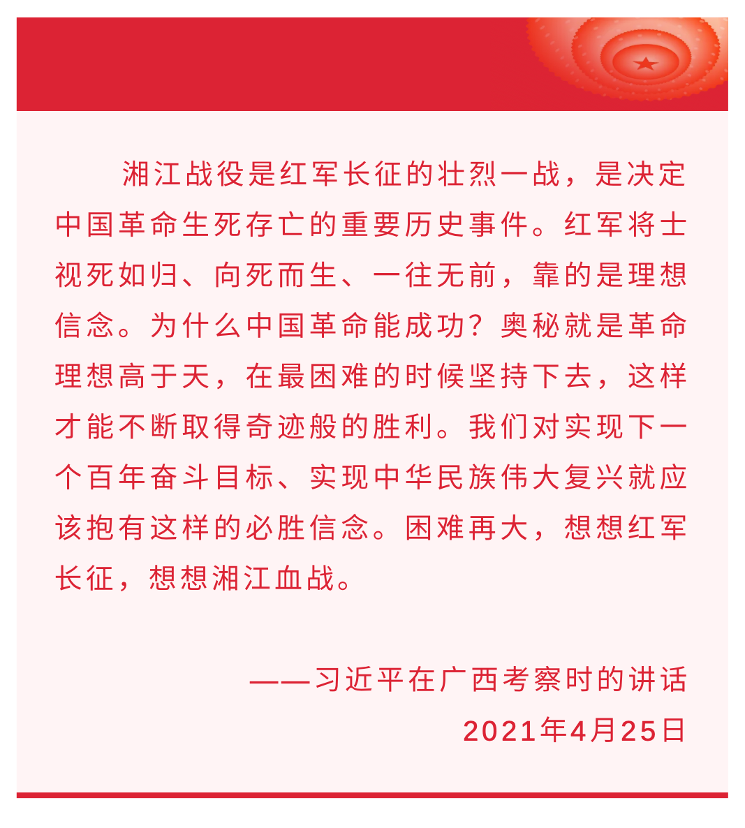 1934年11月下旬至12月上旬,為確保中共中央和中央紅軍主力渡過(guò)湘江,粉碎敵人圍殲紅軍于湘江以東的企圖,數(shù)萬(wàn)紅軍將士浴血奮戰(zhàn),譜寫(xiě)了一曲壯麗的革命史詩(shī)。