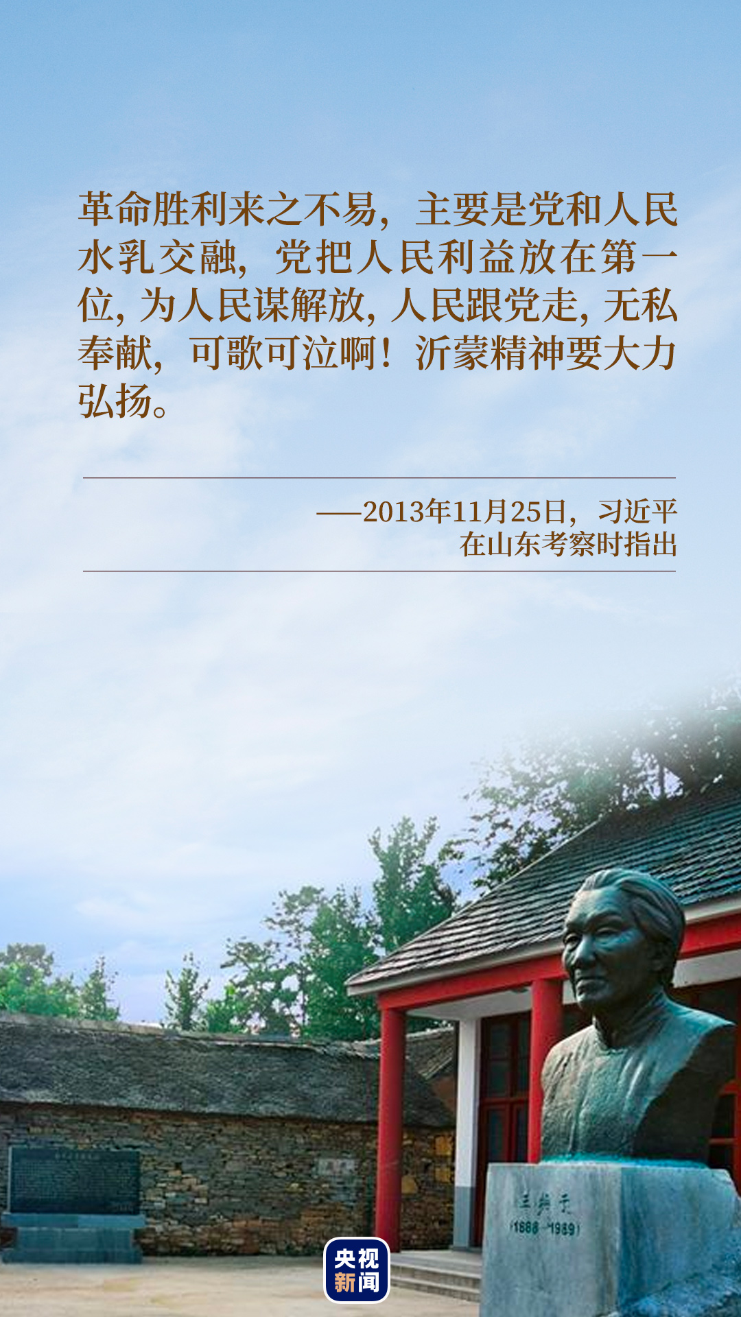 “在沂蒙這片紅色土地上,誕生了無(wú)數(shù)可歌可泣的英雄兒女,沂蒙六姐妹、沂蒙母親、沂蒙紅嫂的事跡十分感人。”習(xí)近平總書(shū)記深情地說(shuō)。2013年11月25日,習(xí)近平在視察山東沂蒙革命老區(qū)臨沂期間,專(zhuān)程前往華東革命烈士陵園,向革命烈士紀(jì)念塔敬獻(xiàn)花籃并參觀沂蒙精神展。