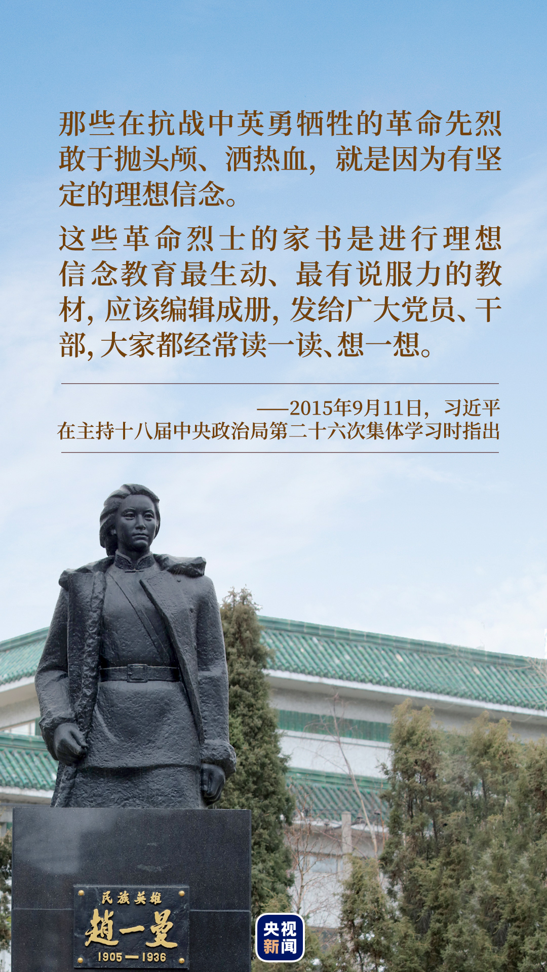 “趙一曼在臨死前的遺書(shū)中寫(xiě)道:‘母親因?yàn)閳?jiān)決地做了反滿抗日的斗爭(zhēng),今天已經(jīng)到了犧牲的前夕了。母親和你在生前是永久沒(méi)有再見(jiàn)的機(jī)會(huì)了……我最親愛(ài)的孩子??!母親不用千言萬(wàn)語(yǔ)來(lái)教育你,就用實(shí)行來(lái)教育你。在你長(zhǎng)大成人之后,希望你不要忘記你的母親是為國(guó)而犧牲的……母親死后,我的孩子要代替母親繼續(xù)斗爭(zhēng),自己壯大成長(zhǎng),來(lái)安慰九泉之下的母親!’”一字一句,總書(shū)記飽含深情。