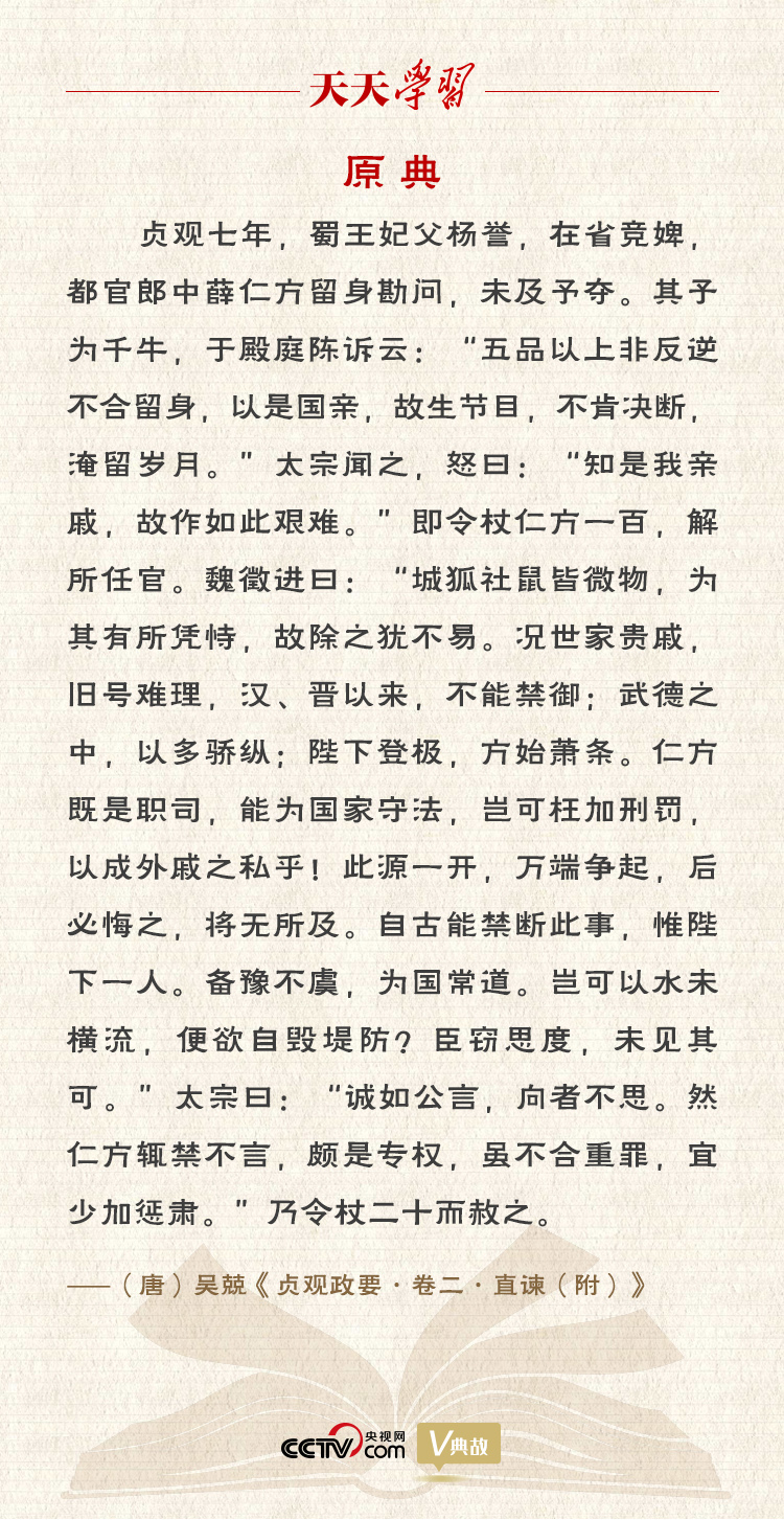 魏徵覺(jué)得唐太宗的做法非常不妥,便進(jìn)諫道:“薛仁方作為國(guó)家官吏,奉公守法,怎么能夠枉加處罰,讓外戚的私欲得逞呢?此例一開(kāi),事端爭(zhēng)起,將來(lái)必然追悔莫及。”勸諫太宗“備豫不虞,為國(guó)常道”,太宗聽(tīng)后有所觸動(dòng)。