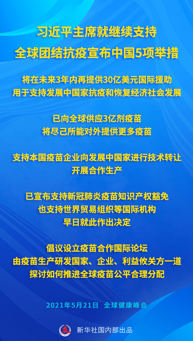 2021年5月,面對(duì)全球疫情的起伏反復(fù),著眼全人類共同需求,習(xí)近平主席在全球健康峰會(huì)上又提出5點(diǎn)意見、宣布5項(xiàng)新舉措。