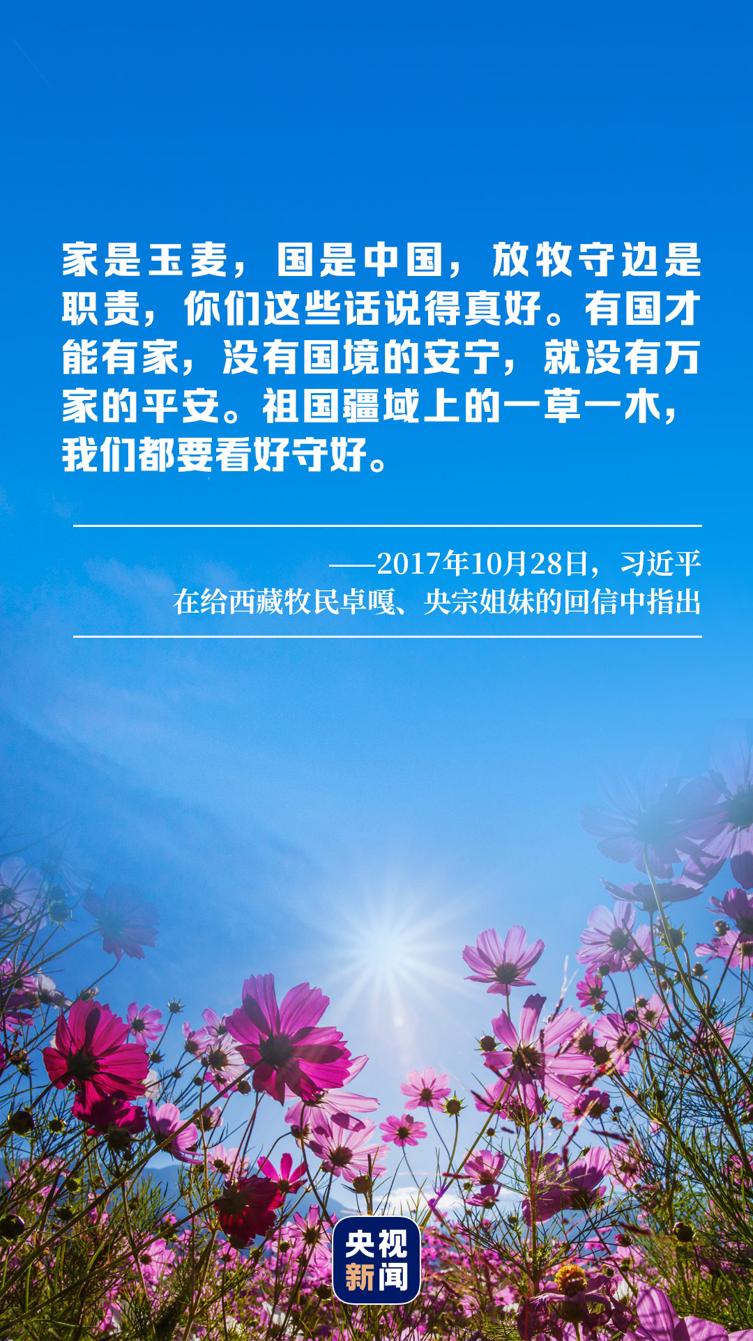 2017年10月,習近平給卓嘎、央宗姐妹回信,稱贊兩姐妹“家是玉麥,國是中國”的境界,強調“有國才能有家,沒有國境的安寧,就沒有萬家的平安”。