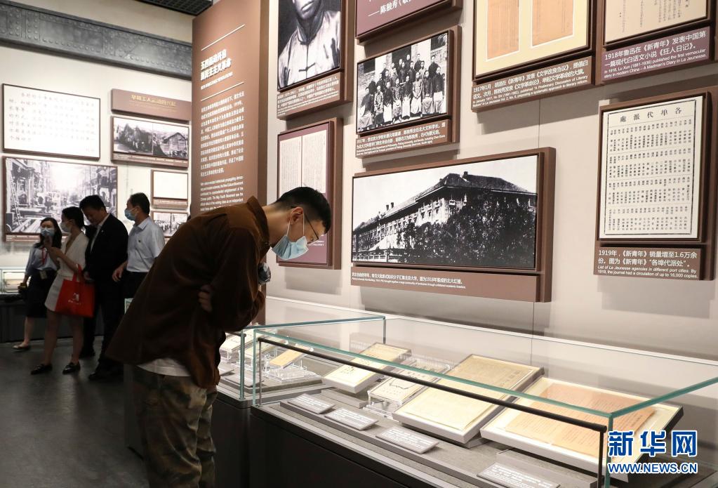 大型立體式視覺置景名為“主義的抉擇”,100件五四運(yùn)動(dòng)前后傳播馬克思主義、社會(huì)主義的報(bào)紙雜志,錯(cuò)落陳列在玻璃墻上。其中,《新青年》第6卷第5號(hào)“馬克思研究專號(hào)”在前端“高光”展示,這期“專號(hào)”標(biāo)志著馬克思主義在中國(guó)的傳播進(jìn)入了較為系統(tǒng)的階段(6月1日攝)。新華社記者 劉穎 攝